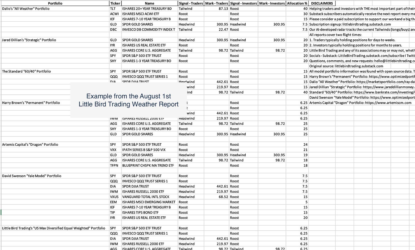 For traders and investors who don’t want to wait for a portfolio rebalance window. Includes seven (7) pre-defined portfolios that you maintain complete control over. Pair with what ever broker or platform you use today. Both the Model Portfolio Excel file and screenshot example from the August 1st Weather Report.