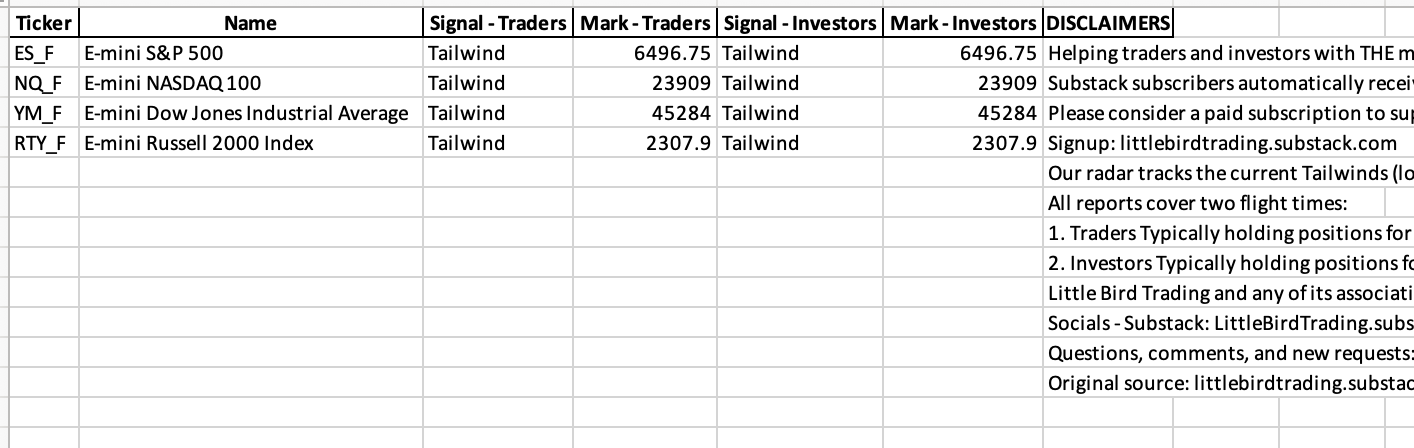 For traders and investors using futures to generate daily returns or leverage portfolio exposure. Tracks ES_F, NQ_F, YM_F, and RTY_F. Both the Weather Report Excel file and screenshot example from the August 18th Weather Report.