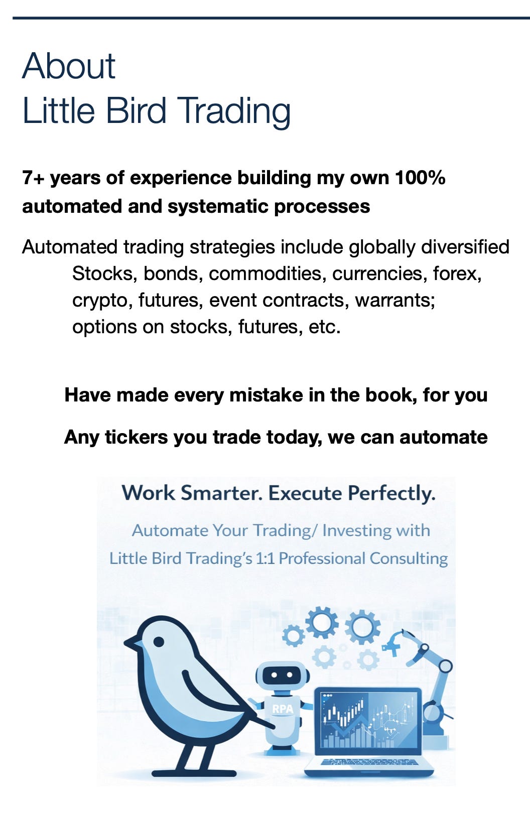 Looking for an expert to automate YOUR trading/ investing process? — I'll automate YOUR Trading/ Investing Process! | Little Bird Trading’s 1:1 Professional Consulting
